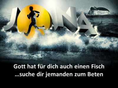 Und das kennen wir sicher auch. Dies mögen Krankheitszeiten sein, Monate der Krise in einer Ehe, Arbeitslosigkeit, depressive Phasen, Nöte mit den eigenen Kindern oder mit den eigenen Eltern oder was weiß ich. Es gibt viele Situationen, wo wir genau das erleben, dass wir nackte Verzweiflung erfahren und ab und zu ein Hoffnungsschimmer. Gott möchte uns aber sagen: Auch wenn du sehr weit unten bist, auch wenn du fix und fertig bist. Gott ist noch nicht am Ende und seine Möglichkeiten und Mittel dich zu retten sind noch nicht erschöpft. Das ist die wichtigste Botschaft. Gott hat für dich noch einen Fisch, den er dir schicken kann, um dich zu retten. Vielleicht ist es nicht einmal ein Fisch, sondern einfach einen Menschen, den er dir helfend an die Seite stellt. Sprich jemanden an nach dem Gottesdienst, hier sind viele, die dir helfen möchten, geht hinten in das kleine Zimmer und betet miteinander…