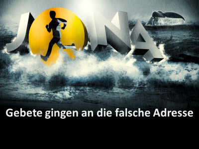 Jona geht auf ein Schiff, das in die entgegengesetzte Richtung fährt. Es kommt zu einem riesigen Seesturm. Das Boot droht unterzugehen. Aber Jona schläft. Er lässt sich hängen, ihm ist es egal, was um ihn herum passiert, die Not der Welt rüttelt ihn nicht wach. Not lehrt Beten, sogar die Matrosen. Die Gebete der Matrosen scheinen nicht viel zu bewirken. Anscheinend ist es ihnen gegangen, wie es uns zuweilen bei den Behörden geht. Keiner der angerufenen Götter schien für den Sturm zuständig gewesen zu sein. All ihre Gebete gingen an die falsche Adresse. Kein Wunder: